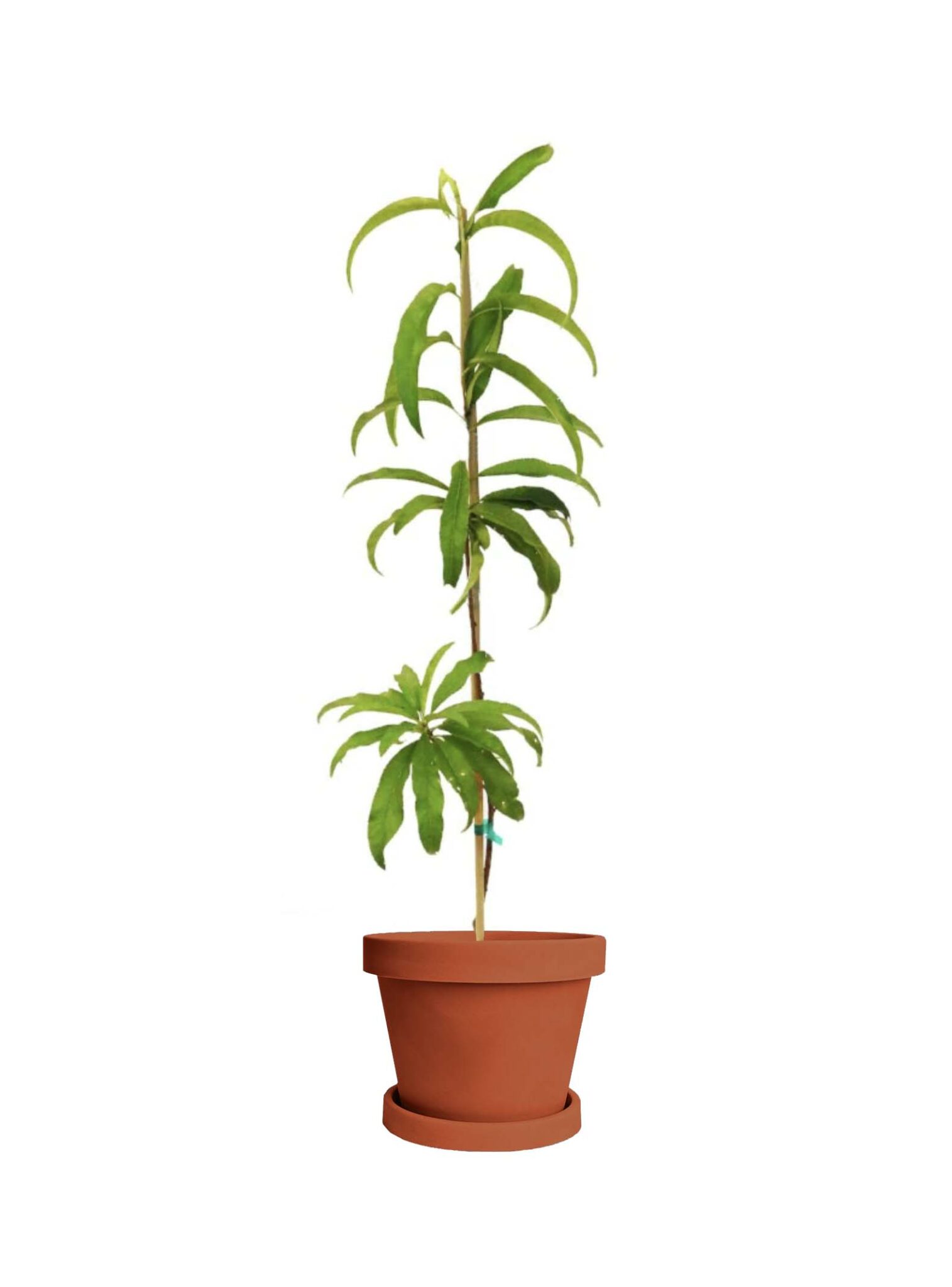 To propagate the peach tree, “grafting” can be done by taking cuttings from a branch with plenty of leaves. Strip the lowest two sets of leaves; at this point, you can optionally dip it in rooting hormone. Place the cutting standing up in a pot, and cover it with a clear bag to keep the moisture in and protect it from direct sun. The soil should be kept moist.
