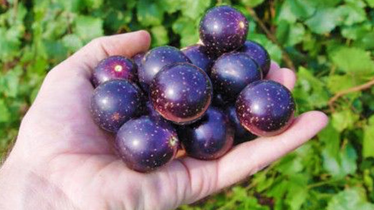 Delicious Muscadine Grapes are large, and established vines in a cared-for location can produce grapes an inch wide or more. The ripe fruit is shiny, deep black, oval-shaped, and grows in clusters. Harvest Delicious Muscadine Grapes from early August through early fall. The fruit is ready when it is juicy and has a sweet, slightly tangy flavor. The ripe Delicious Muscadine Grapes can be kept refrigerated for seven or eight days.