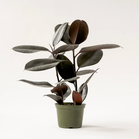 A rubber tree plant is also known as a Ficus elastica. It is upward growing with stiff large darkly color leaves. Native to southern Asia, this plant was used for latex products prior to synthetic rubber products. In their natural habitat Rubber plants can grow up to 100 feet! They are also capable of filtering xylene, benzene, formaldehyde and trichloroethylene.